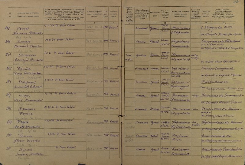 - Держать в голове что при составлении часто делались ошибки в ФИО, дате рождения и других данных, смотреть все в контексте. Например: вместо Соснин Иван Максимович написано Соснин Григорий Степанович. Но все остальные данные - дата рождения, призыв, ФИО жены соответствуют Ивану.